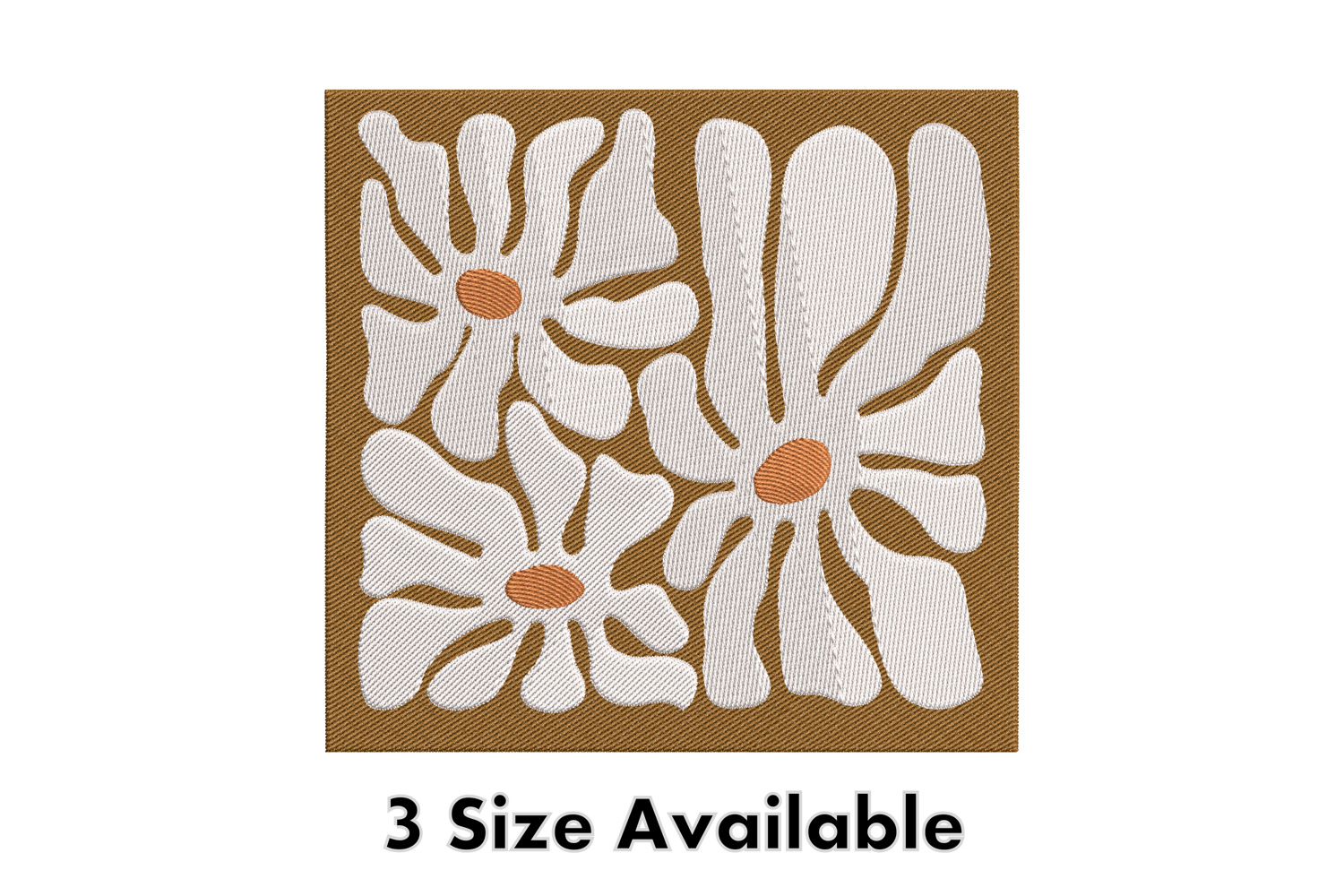 This Retro Daisy Floral Cutout Embroidery Design features three bold white daisies with warm orange centers set against a cozy brown background. The playful cutout style adds a modern twist to the classic flower motif, creating a timeless look that blends vintage and contemporary aesthetics.
