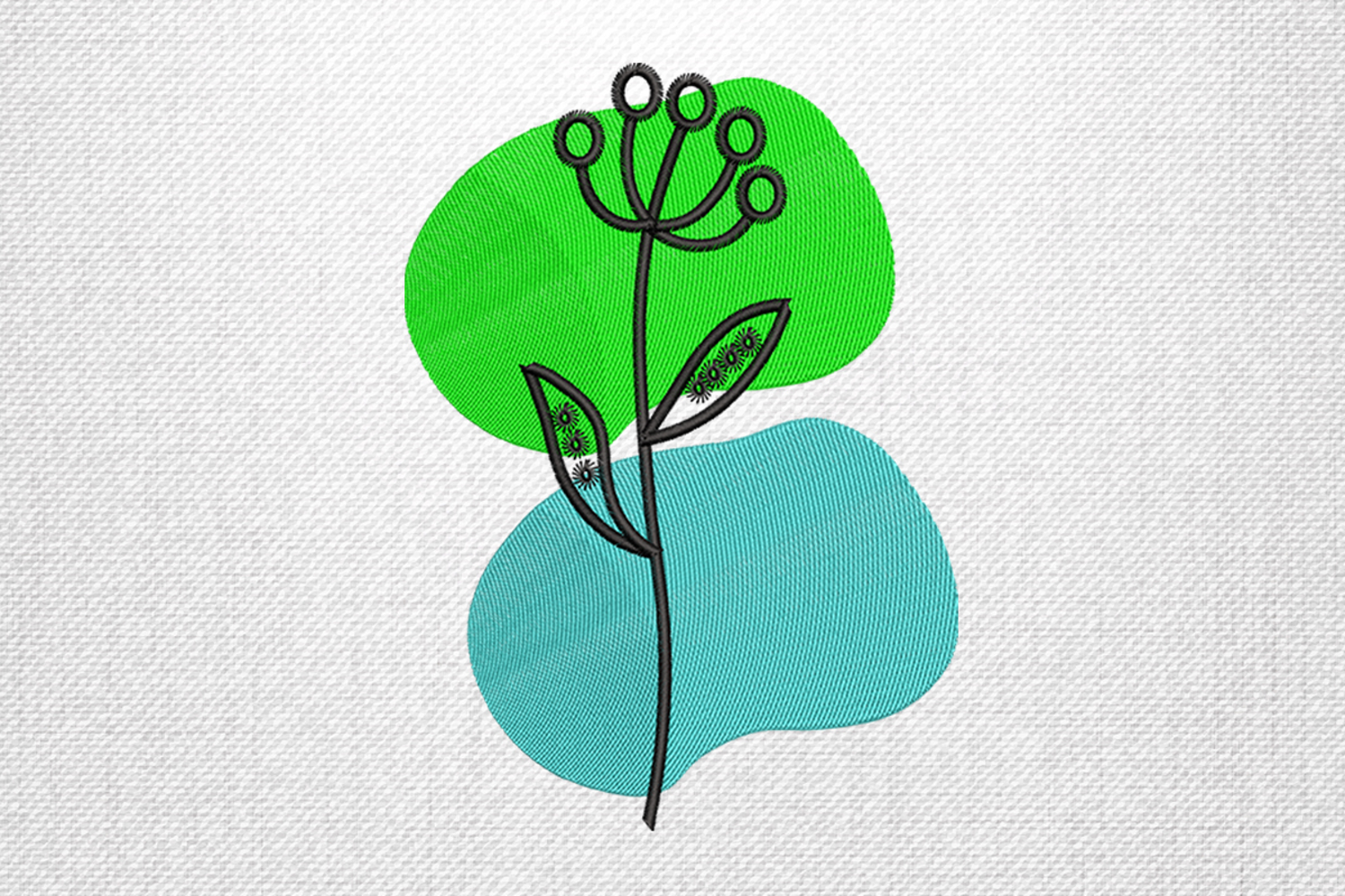 This Modern Minimalist Botanical Embroidery Design features a unique abstract stem with round buds and two leaves placed over soft green and teal shapes. Its clean, contemporary aesthetic blends simplicity with artistic flair, making it ideal for trendy embroidery projects. Perfect for adding a fresh, stylish accent to fabrics, home décor, or fashion pieces.