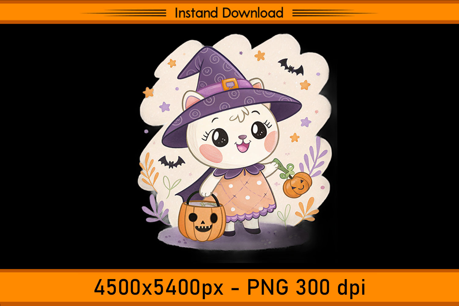 This Cute Halloween Girl Witch Hat Sublimation Design features an adorable little witch holding a pumpkin bucket, dressed in a soft peach dress and purple hat surrounded by bats, stars, and autumn leaves. The warm tones and charming details make this the perfect Halloween-themed design for your festive creations.