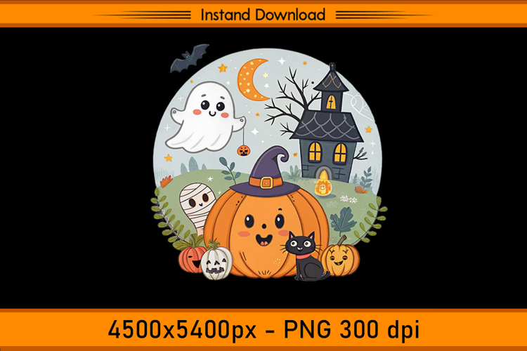 This Cute Pumpkin Ghost and Cat Halloween Scene Sublimation Design features an adorable smiling pumpkin wearing a witch hat, surrounded by a friendly ghost, a black cat, little pumpkins, a mummy, and a haunted house glowing under the moonlight. The playful Halloween scene is filled with cozy autumn vibes and sweet spooky charm.