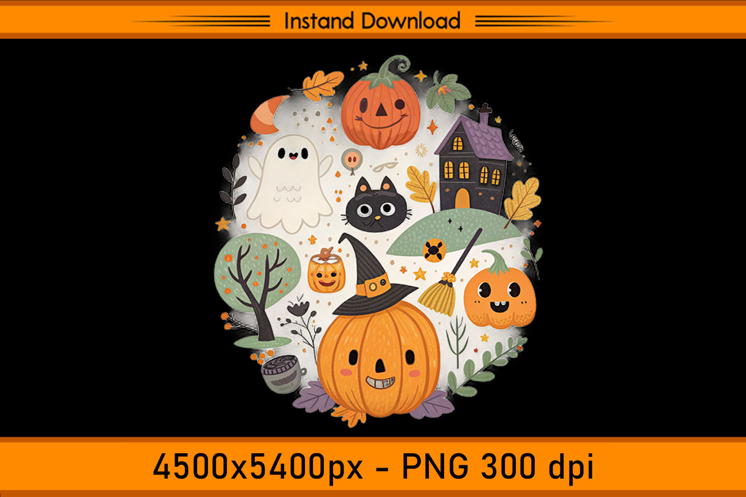 This Cute Pumpkin Ghost and Cat Halloween Sublimation Design brings a joyful Halloween scene to life! The artwork showcases a smiling pumpkin wearing a witch hat, a friendly ghost, a playful black cat, and a cozy haunted house surrounded by autumn leaves, stars, and trees. With its warm fall colors and adorable details, this design is perfect for crafting projects and seasonal products.