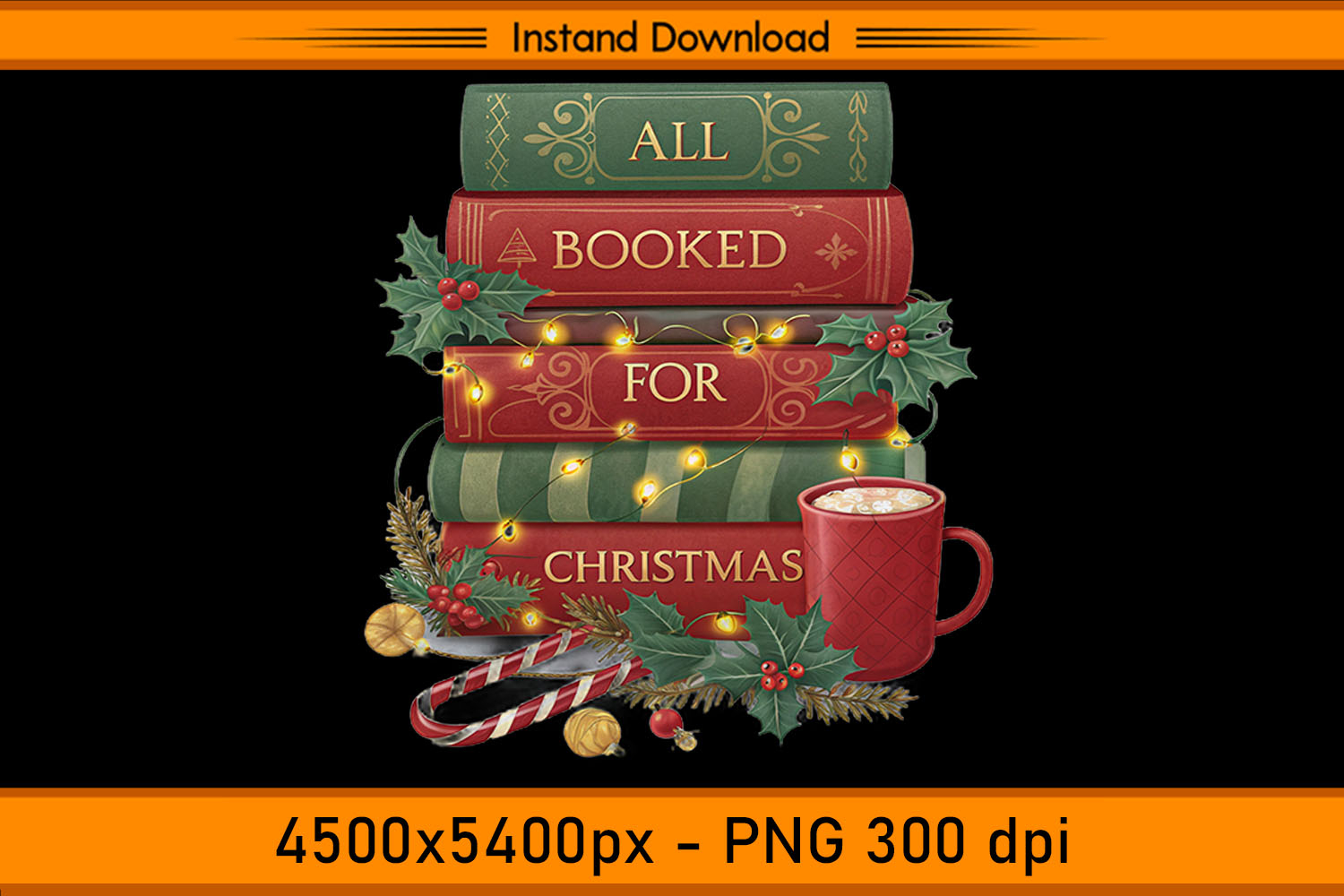 This festive Christmas Sublimation Design features a cozy stack of red and green books with golden lettering that reads “All Booked for Christmas.” Surrounded by glowing string lights, holly leaves, candy canes, and a red mug of hot cocoa topped with marshmallows, this design radiates holiday warmth and bookish joy.