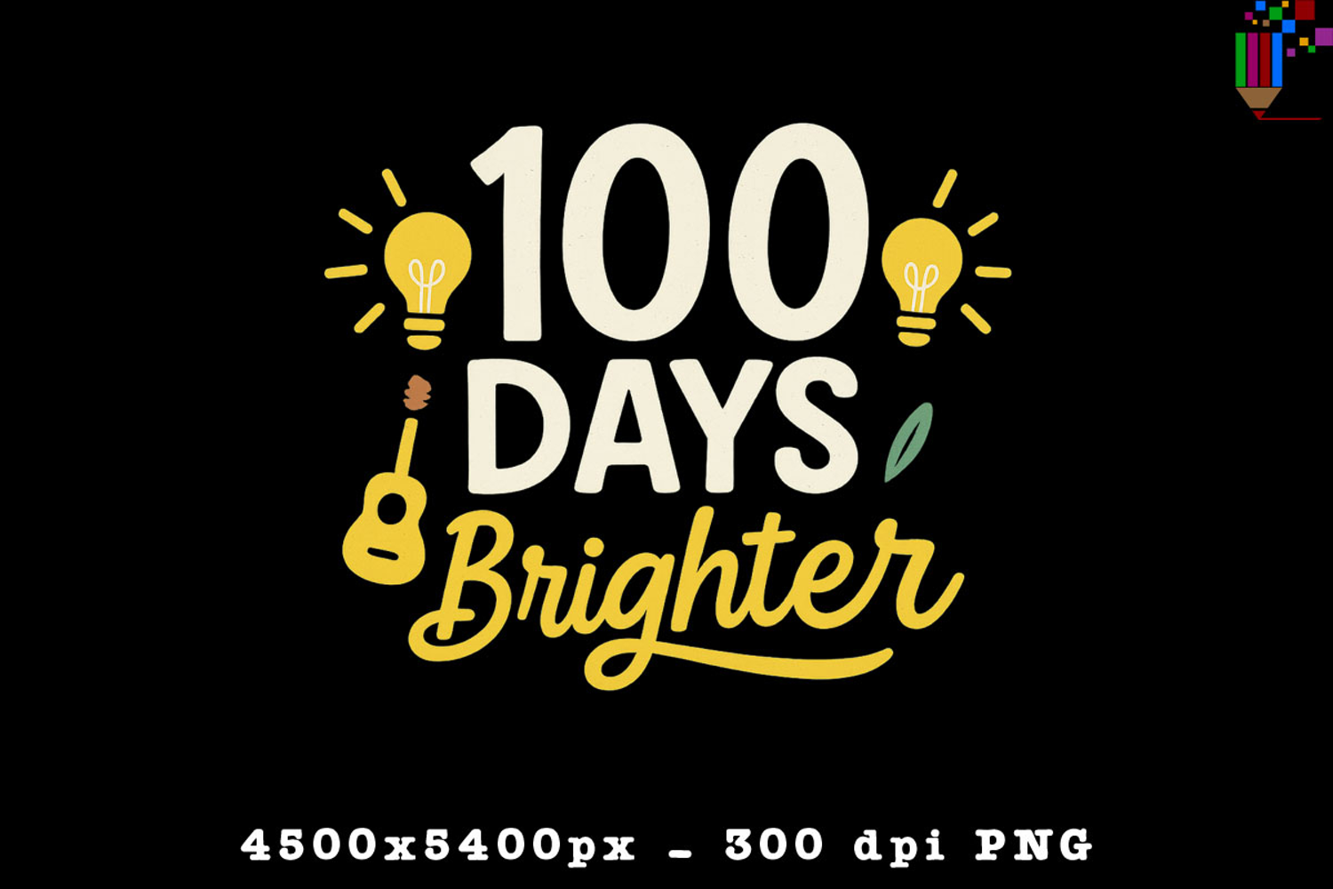This Cheerful 100 Days Brighter Sublimation Design celebrates learning, growth, and creativity with a bright and happy style. Featuring glowing light bulbs, a small guitar, and elegant script text, it captures the joy of reaching 100 days of school with positivity and inspiration. Perfect for teachers, students, and classrooms filled with imagination and light.