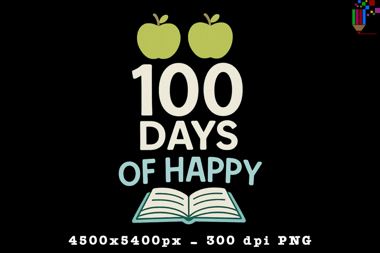 This Cheerful 100 Days of Happy Sublimation Design celebrates learning, joy, and growth in a fun and heartwarming way. It features two bright green apples and an open book illustration, symbolizing knowledge and happiness through 100 days of school. Perfect for teachers, students, and classroom celebrations that highlight positive learning experiences.
