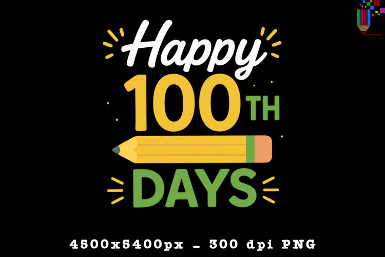 This Bright and Cheerful Happy 100th Days of School Sublimation Design captures the excitement of a classroom milestone. Featuring a large yellow pencil, fun green and gold lettering, and playful spark accents, this design spreads happiness and creativity for the 100th day celebration. Perfect for teachers, students, and school spirit wear.