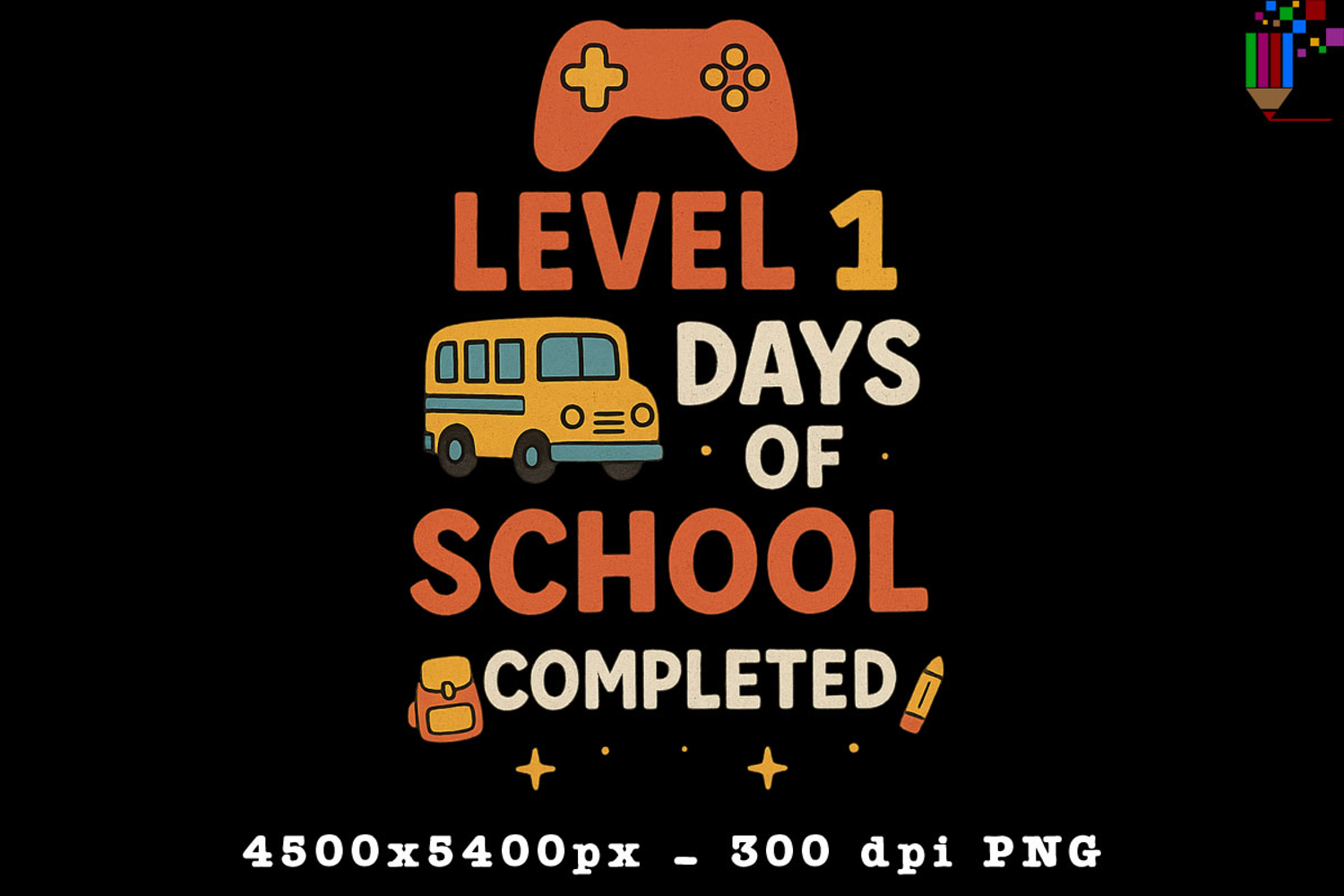 Celebrate a fun school milestone with this playful Level 1 Days of School Completed Sublimation Design! Featuring a cute yellow school bus, game controller, and classroom icons, this design is perfect for kids who love gaming and are just starting their learning journey.