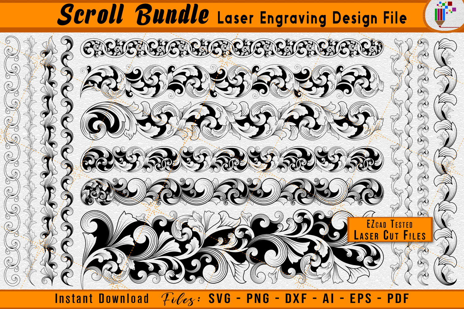 Enhance multiple engraving projects at once with this Scrollwork Slide Bundle / Package Laser Engraving Design File. This collection features a coordinated set of scroll patterns designed to provide visual consistency across multiple slide or surface engravings while still allowing flexibility in layout and scale. Each scroll design in the bundle is carefully balanced with flowing curves and clean spacing, making them suitable for both full-coverage engraving and selective accent detailing. This decorative scrollwork pattern is ideal for firearms, gun parts, knives, metal plates, wood projects, leather goods, signage, and custom accessories, giving you the freedom to apply the same aesthetic across different materials and products.
