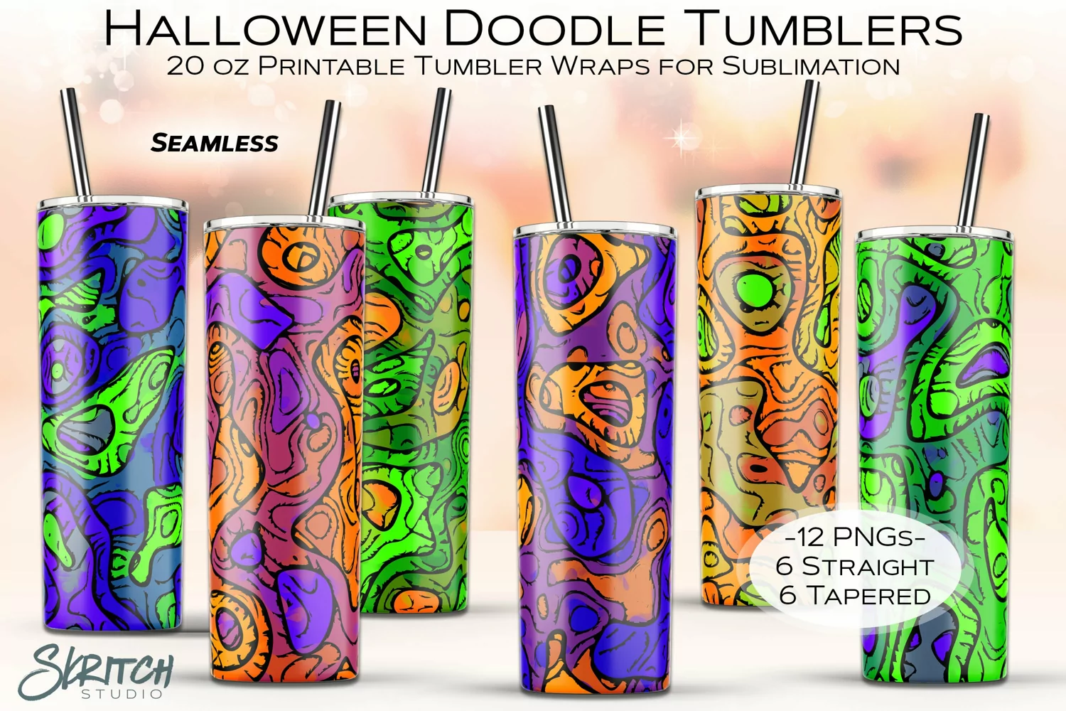 These seamless skinny tumbler sublimation wraps feature fun doodles in orange, green and purple for Halloween.
