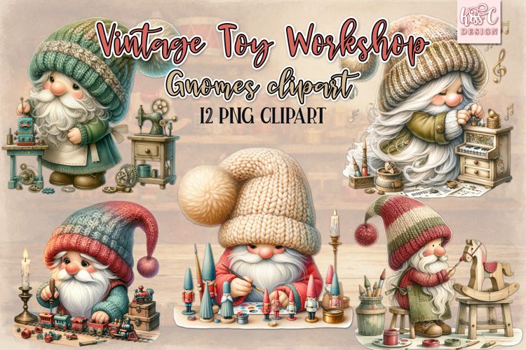 Similar Design Products to Vintage Toy Workshop Gnomes | Retro Christmas Clipart Set