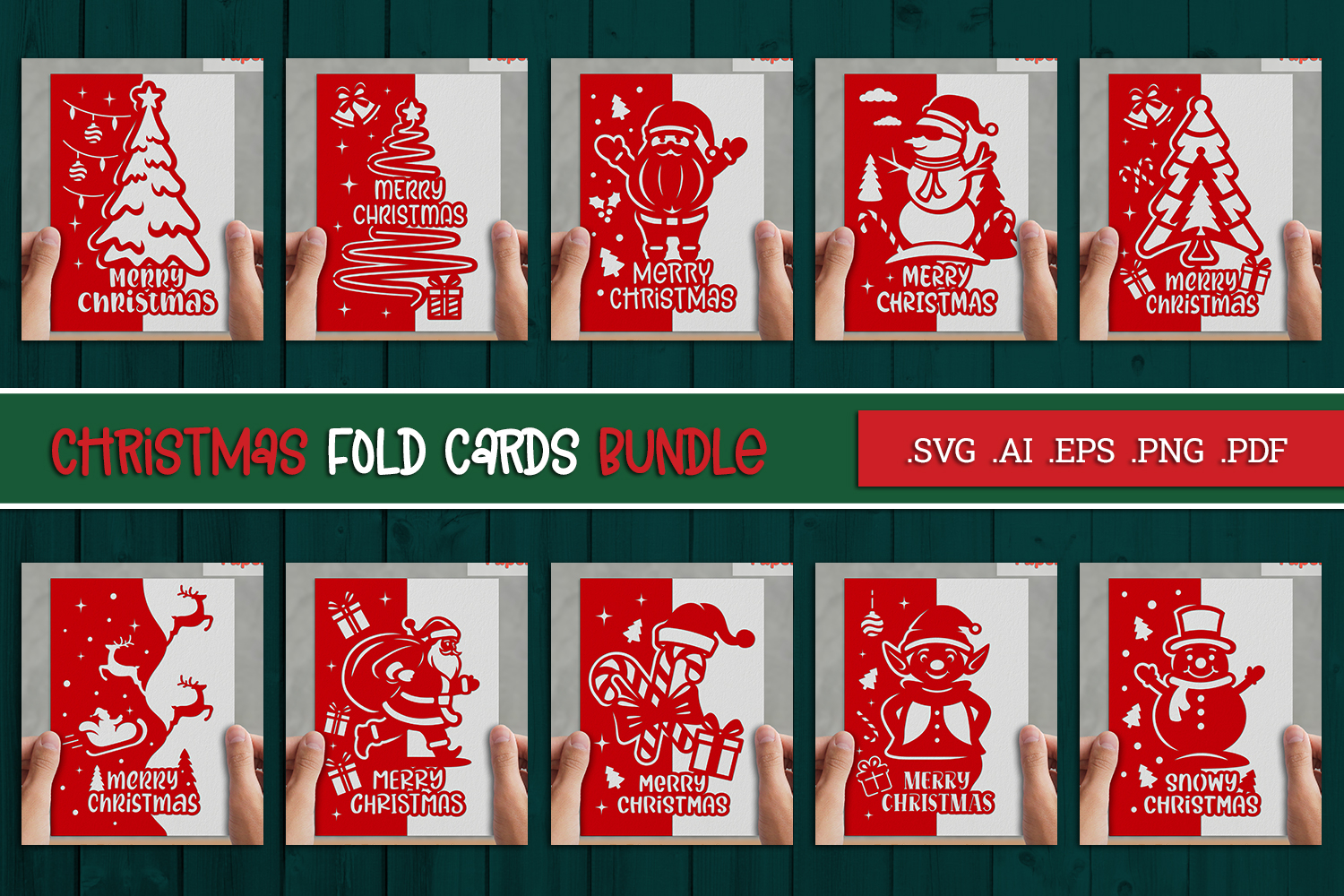 Bundle of 10 5x7 inch folded Christmas paper cut cards design. Each are available in 2 design versions, the other one is for decal use.