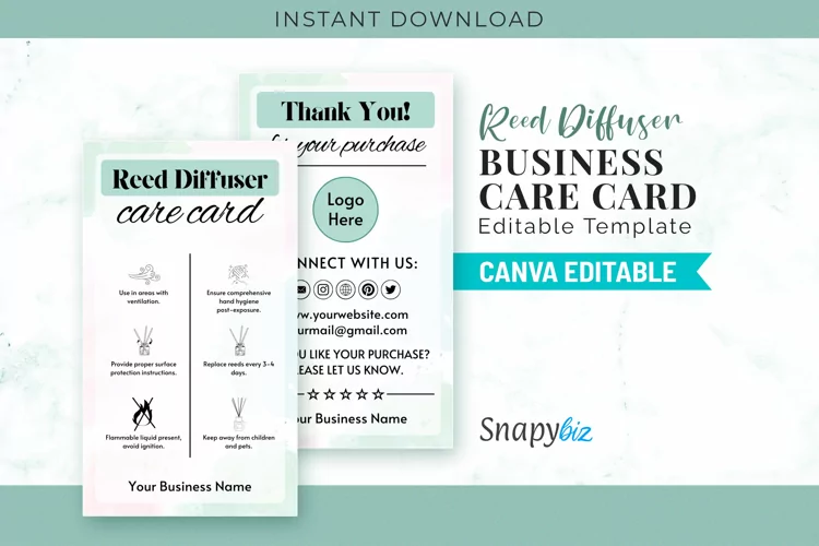 Designed with your success in mind, this editable Reed Diffuser Instructions template is perfect for creating eye-catching care cards for your reed diffuser products.