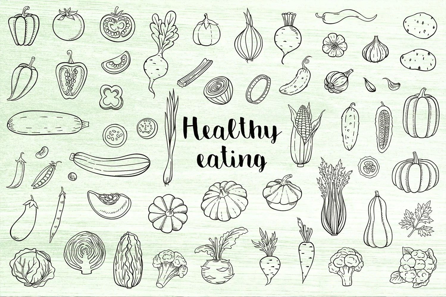 This is a collection of hand drawn doodle vector vegetables. This kit includes 56 different elements, 2 backgrounds and 6 seamless patterns.