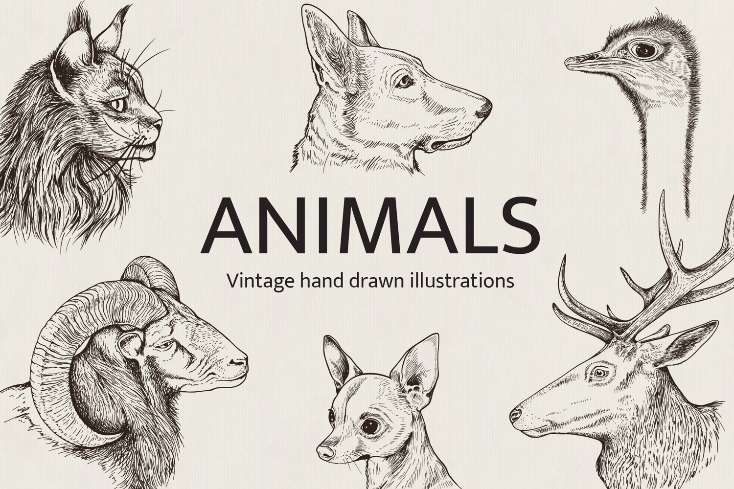 This is a collection of hand drawn vector vintage portraits of animals. This kit includes 6 different illustrations.