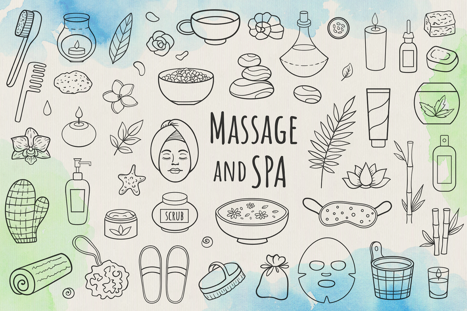 This is a collection of hand drawn doodle massage and SPA salon design elements. This kit includes 51 different elements, 4 seamless patterns and 4 ready to use backgrounds.