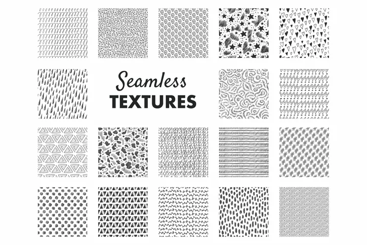 Hand drawn pattern. Abstract seamless texture. Monochrome minimalist background. Collection of graphic ornaments and hatchings. Wallpaper template, decorative textile prints. Vector doodle sample set