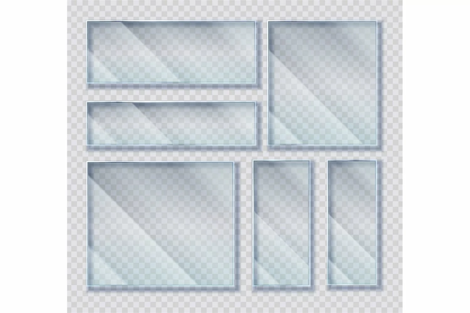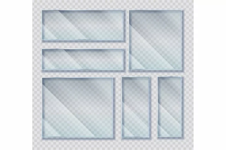 Glass plates set. Acrylic frames banners on transparent background collection, realistic empty square plastic protective screen on wall, picture border template vector isolated advertising mockup