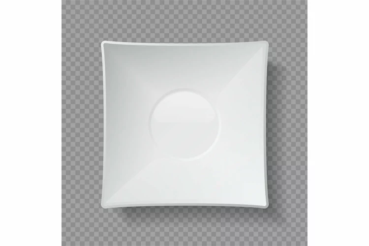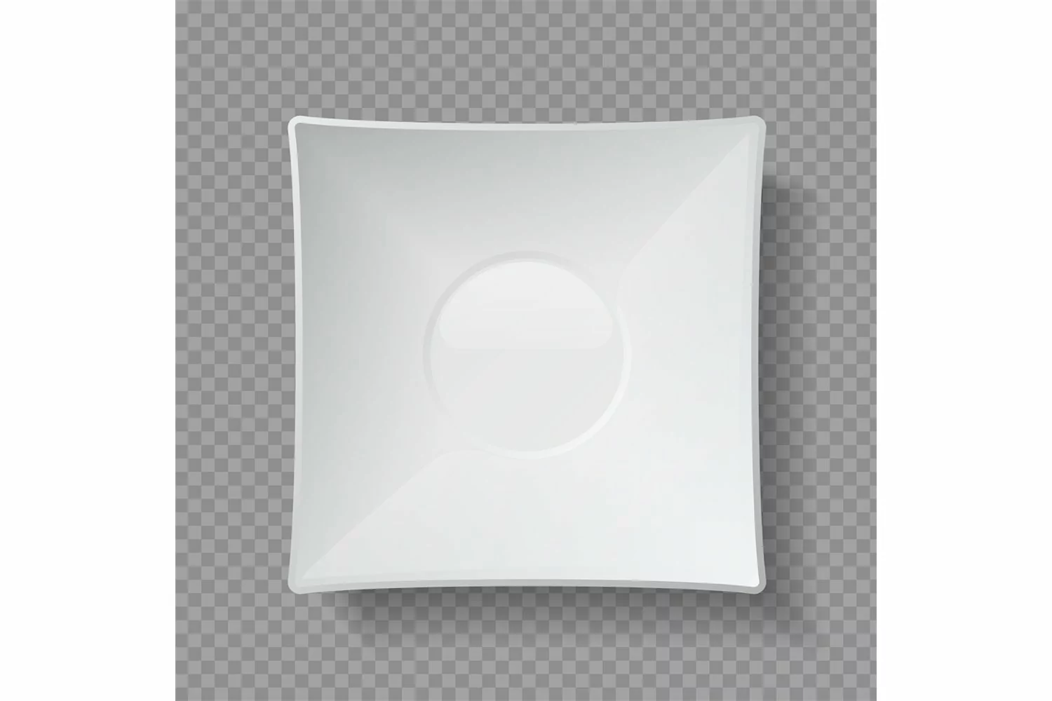 Realistic food plates. 3D empty utensil. Isolated ceramic and porcelain tableware or plastic disposable dish. Top view of household kitchenware. Vector white square crockery on transparent background