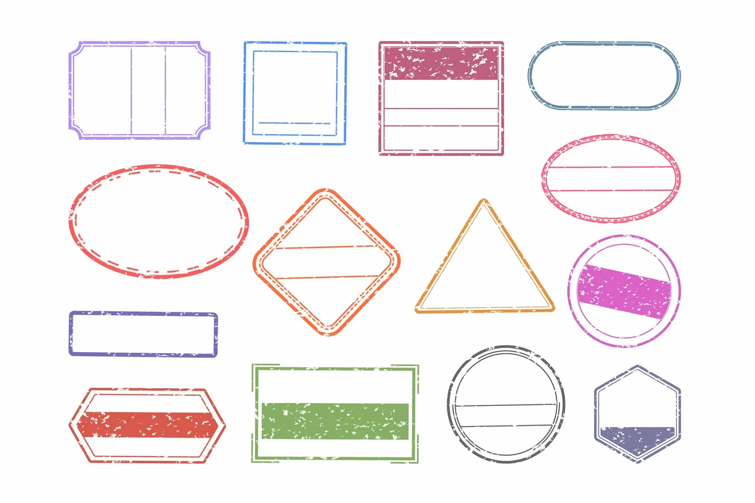 Grunge stamp. Blank geometric stamps. Ink imprints set with copy space. Round, square or triangular impress of rubber signs. Empty contour seals and labels mockup for branding. Vector colorful frames