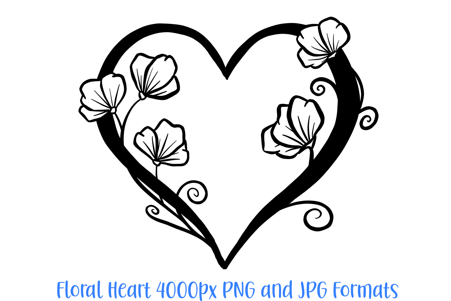 The Sweet Pea Floral Heart Wreath is a whimsical, hand-drawn digital graphic that combines vibrant, multicolored blooms with a bold romantic silhouette. Featuring a playful arrangement of sweet pea blossoms in teal, yellow, and pink nestled against a thick black heart frame with elegant swirls, this design is a fantastic resource for designers creating children’s nursery art, cheerful greeting cards, boutique packaging, and custom apparel.