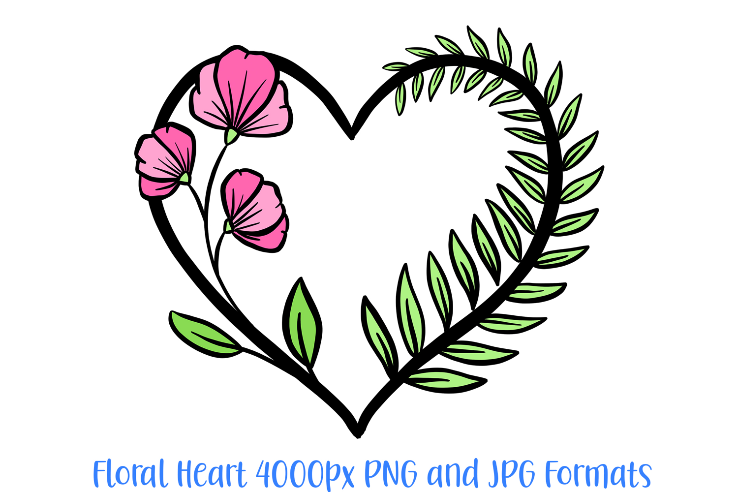 The Sweet Pea Leaves Floral Heart is a charming, hand-drawn digital graphic that beautifully balances delicate botanicals with a bold, romantic frame. This illustration features three vibrant pink blossoms climbing one side of a sturdy black heart silhouette, while the other side is elegantly adorned with a lush, sweeping green leaf branch. It is a premier resource for designers crafting whimsical nursery wall art, spring-themed wedding stationery, boutique garden branding, and custom apparel.