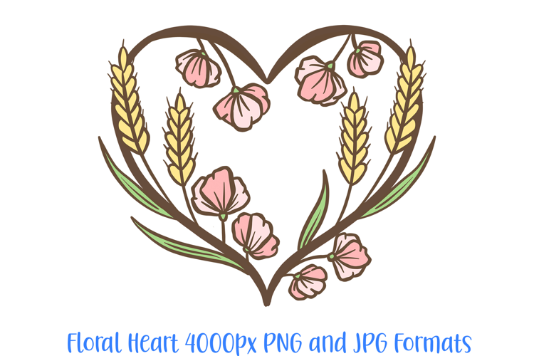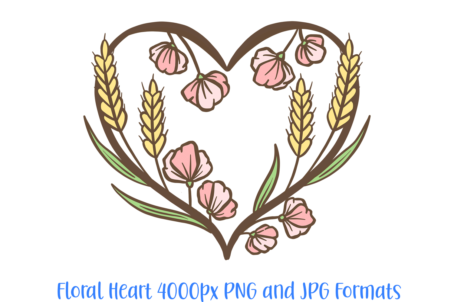 The Harvest Wheat & Sweet Pea Heart Wreath is a rustic, hand-drawn digital illustration that perfectly captures the warm, abundant spirit of the autumn season. This charming design features four golden stalks of wheat arranged symmetrically to form a sturdy heart-shaped frame, beautifully accented by delicate pink sweet pea blossoms that appear to float within the center. It is a premier choice for designers working on Thanksgiving stationery, farmhouse-style kitchen decor, artisanal bakery branding, and seasonal harvest festival graphics.
