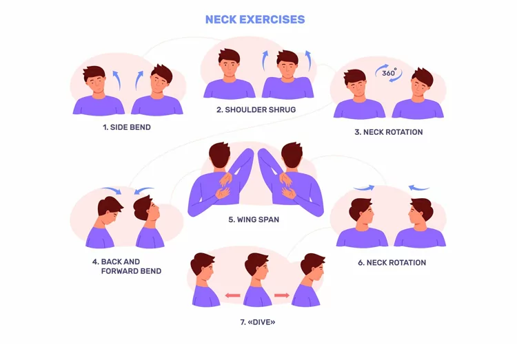 Neck syndrome. Stretch extension exercise for relieving pain necks bad stretching, head exercises office workout, body man tension relax job, infographic vector illustration. Posture flexible