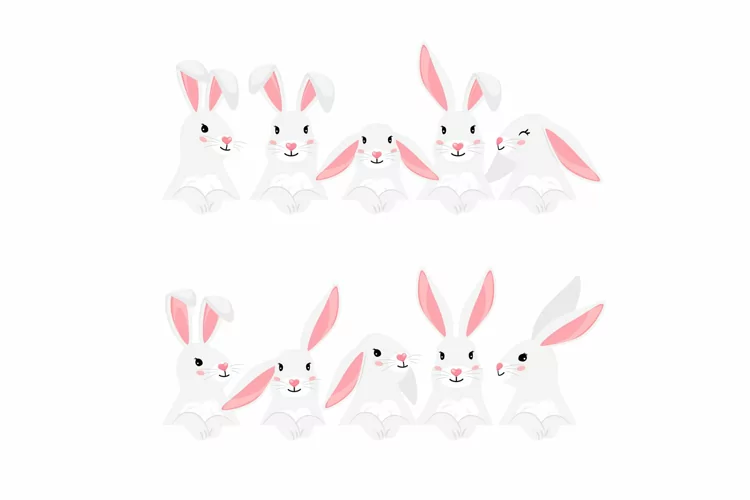 Funny bunny pets collection for your design. Chinese new year symbol. White furry hares isolated on white background. Vector illustration of cartoon cute easter characters rabbits. Funny pet fun sweet