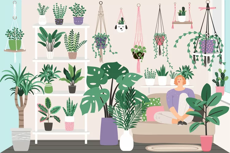 Houseplants in trendy hygge style. Home plants in flower pots. Urban jungle decor set . Evergreen in planters hanging in woven macrame. Woman relaxing on sofa in greenhouse. Vector illustration