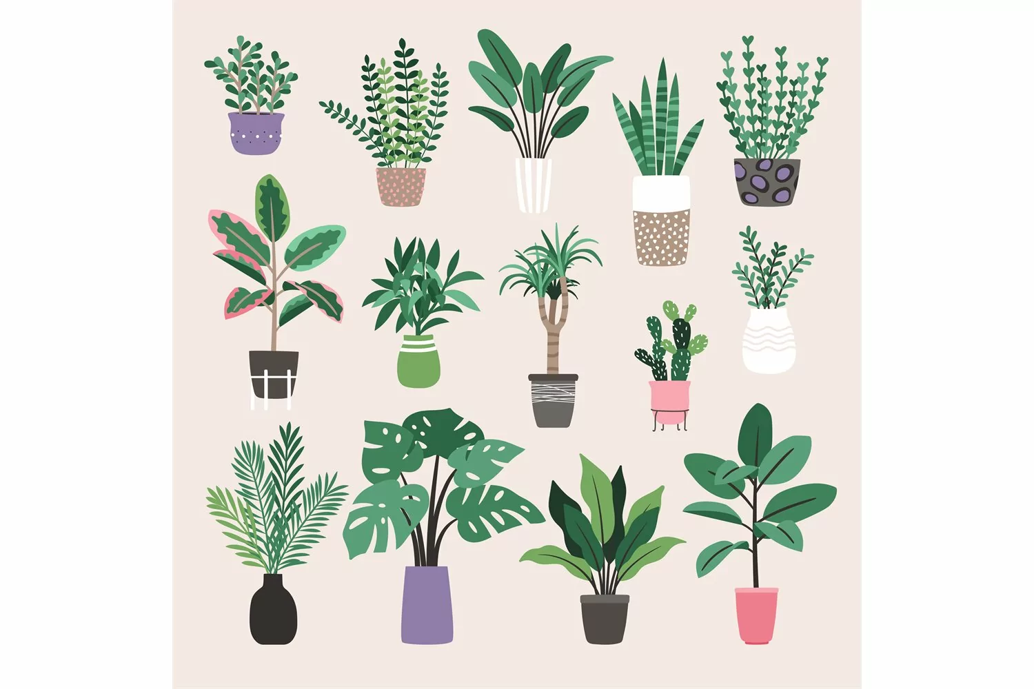 Houseplants in trendy hygge style. Collection of Home plants in flower pots. Urban jungle decor set . Evergreen plants in planters. Illustration of houseplant interior