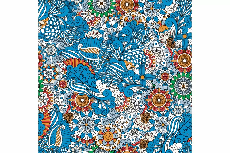 Full frame background made from floral designs and geometric patterns colored blue red green and brown