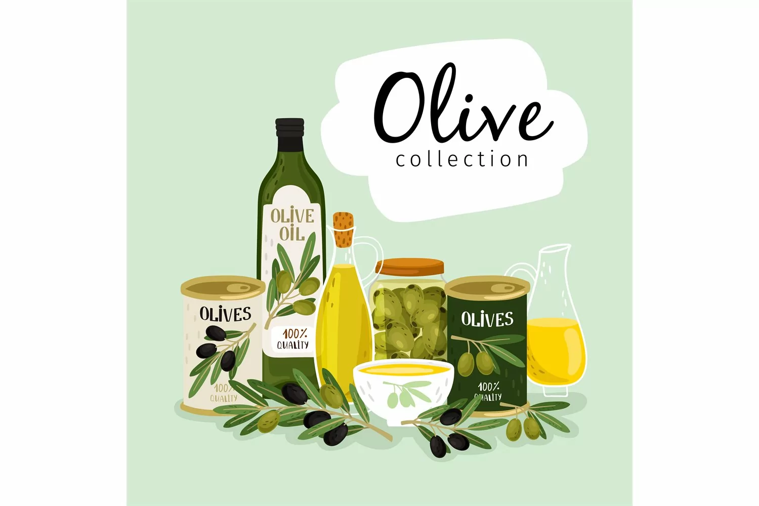 Olives and olive oil. Natural olives oils, glass and metallic cans, olive branches vector collection on green background