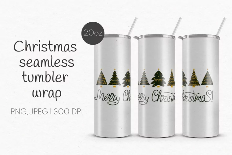 Christmas tumbler sublimation wrap with Merry Christmas lettering and Cristmas trees on white and transparent background is perfect for 20oz skinny tumblers. Seamless tumbler wrap is ready to print. Please note that the colors on your screen can differ from the final product.