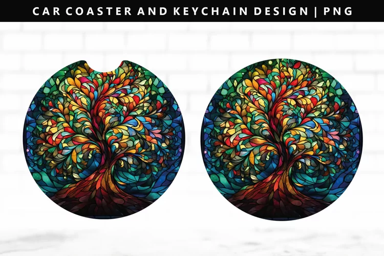 Car Coaster Sublimation Round Coaster Round Keychain Design Christmas Car Coaster Design Car Coaster Design Png Round Coaster Sublimation Design Round Coaster Png Stained Glass Car Coaster Stained Glass Round Sublimation Christmas Tree Car Coaster