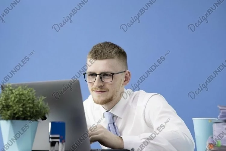 Young handsome Caucasian cheerful man dressed in a classic shirt with a blue tie. Stylish office interior.