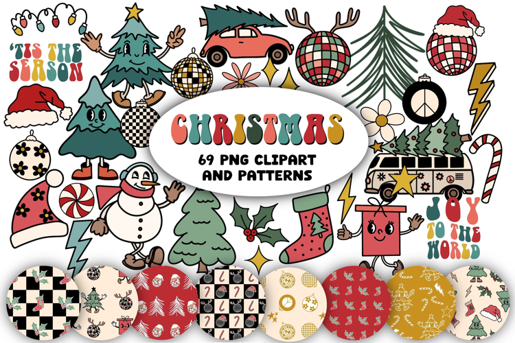 Christmas Groovy Clipart PNG Elements & Seamless Patterns
