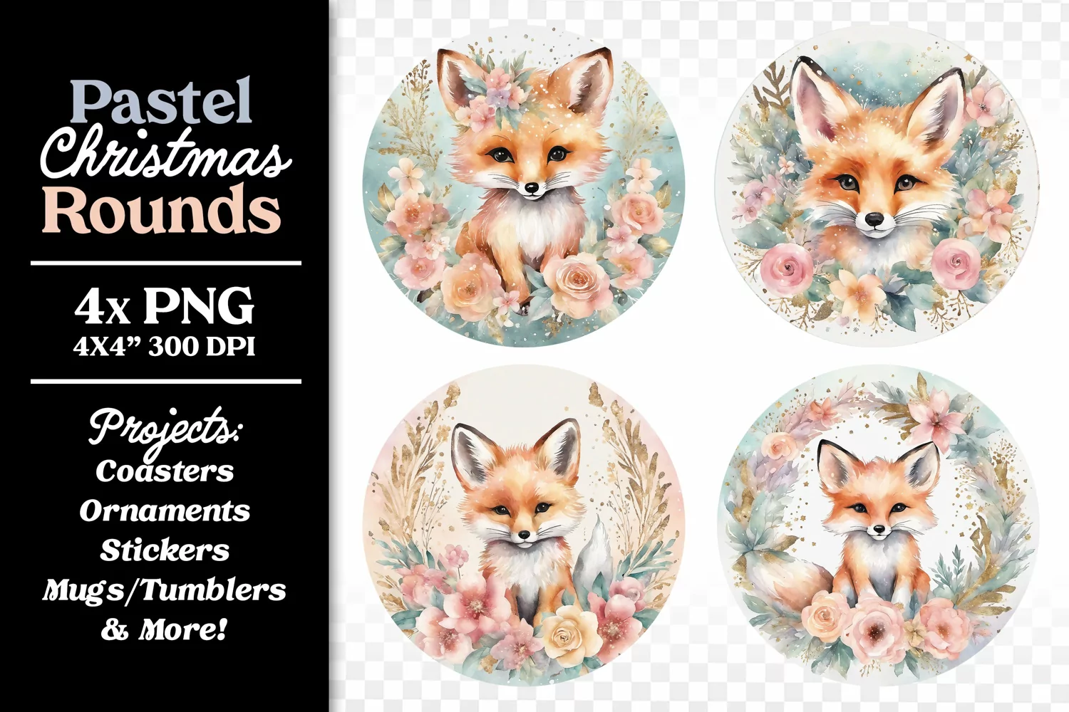 Similar Design Products to Watercolor Fox Christmas Round Ornament Coaster Clipart