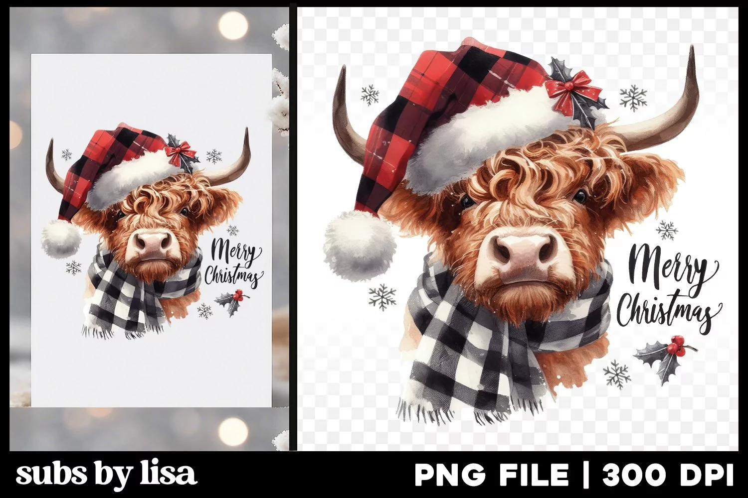 Merry Christmas Highland Cow Sublimation Design Watercolor