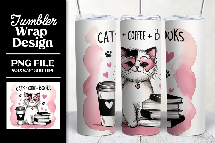 Cats Coffee Books Tumbler Wrap Sublimation Design