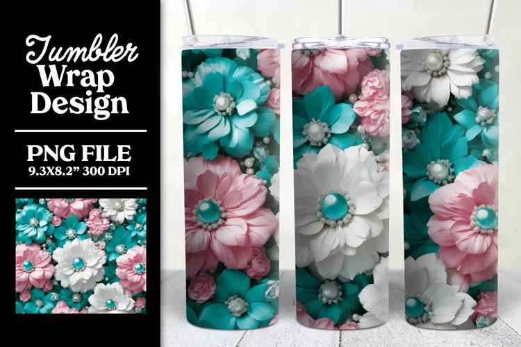 3d Flowers Tumbler Wrap Sublimation Design Pink Teal Floral
