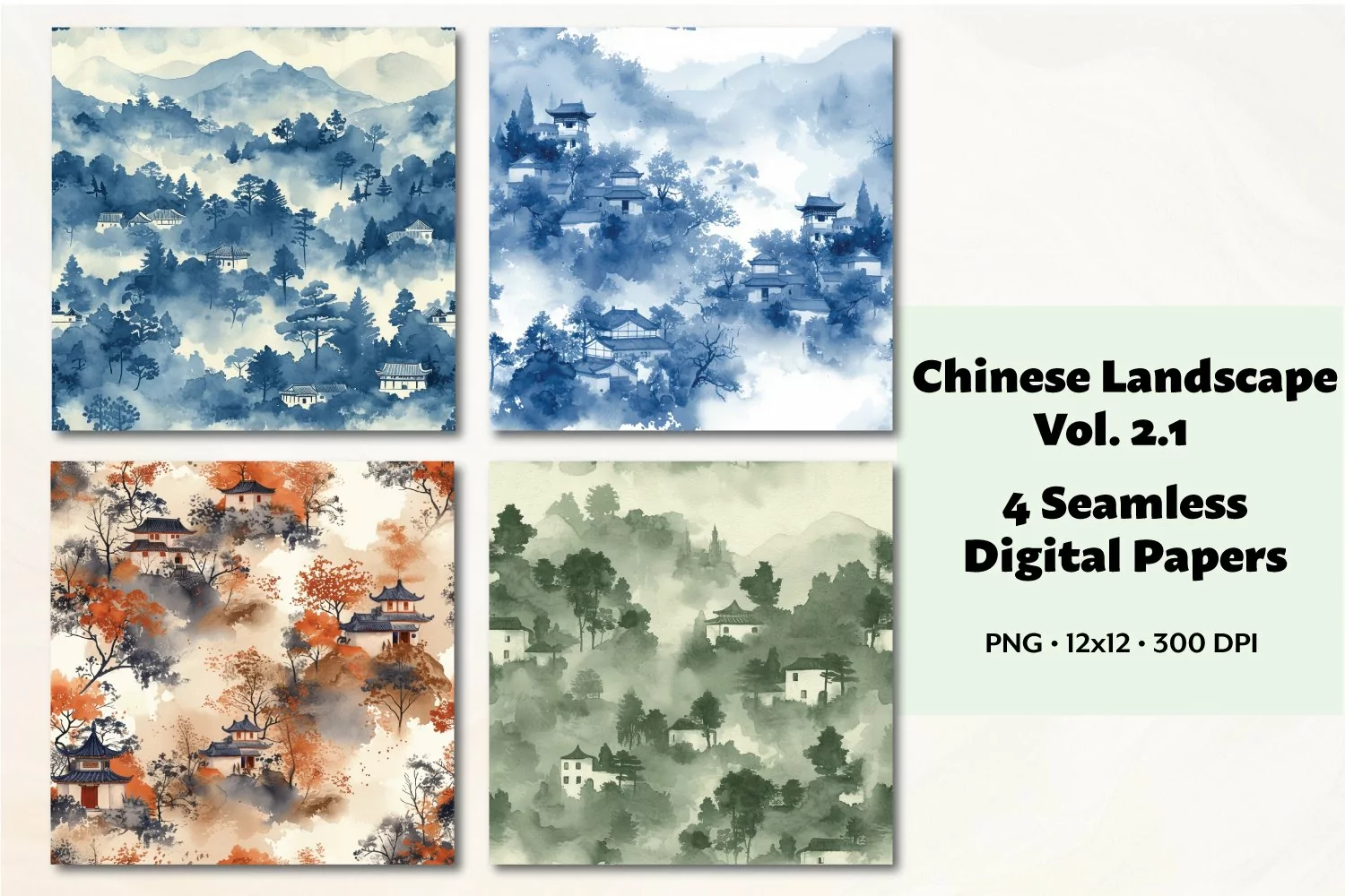 Introducing our collection of 4 beautiful watercolor Chinese landscape digital papers! Each design features a seamless repeating pattern that adds a touch of elegance to any project. With delicate colors that capture the essence of traditional Chinese landscapes, these papers are perfect for crafting, scrapbooking, and more. Instantly download and enhance your creative endeavors with these stunning digital papers. Transform your designs with the beauty of Chinese art, all at your fingertips!