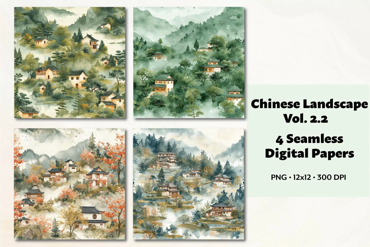 Introducing our collection of 4 beautiful watercolor Chinese landscape digital papers! Each design features a seamless repeating pattern that adds a touch of elegance to any project. With delicate colors that capture the essence of traditional Chinese landscapes, these papers are perfect for crafting, scrapbooking, and more. Instantly download and enhance your creative endeavors with these stunning digital papers. Transform your designs with the beauty of Chinese art, all at your fingertips!