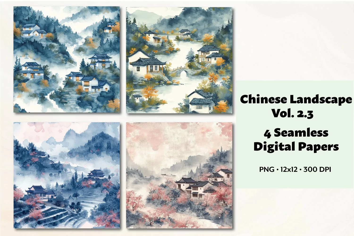 Introducing our collection of 4 beautiful watercolor Chinese landscape digital papers! Each design features a seamless repeating pattern that adds a touch of elegance to any project. With delicate colors that capture the essence of traditional Chinese landscapes, these papers are perfect for crafting, scrapbooking, and more. Instantly download and enhance your creative endeavors with these stunning digital papers. Transform your designs with the beauty of Chinese art, all at your fingertips!