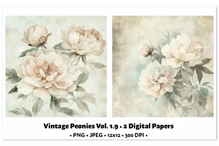 Vintage Peonies Digital Paper Vol. 1.9, 2 PNG & JPEG