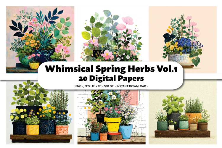 Whimsical Spring Herbs Digital Paper Pack, 20 PNG & JPEG