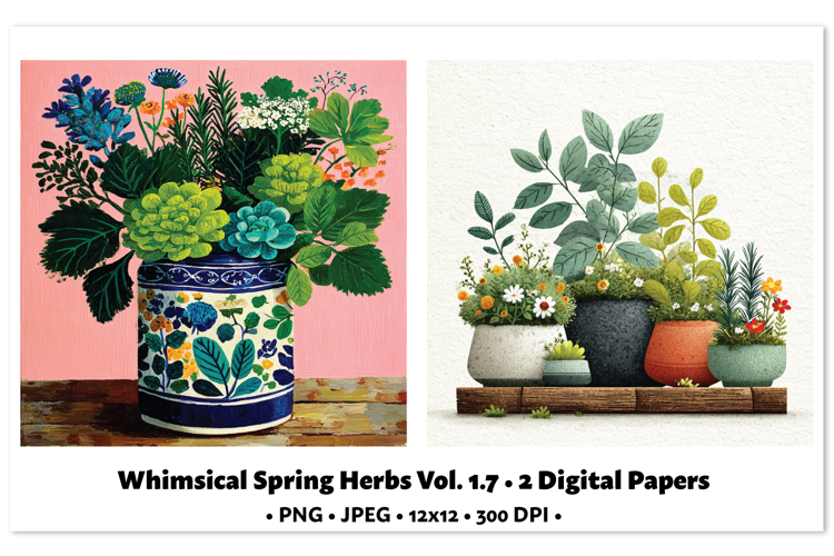 Whimsical Spring Herbs Digital Paper Vol. 1.7, 2 PNG & JPEG