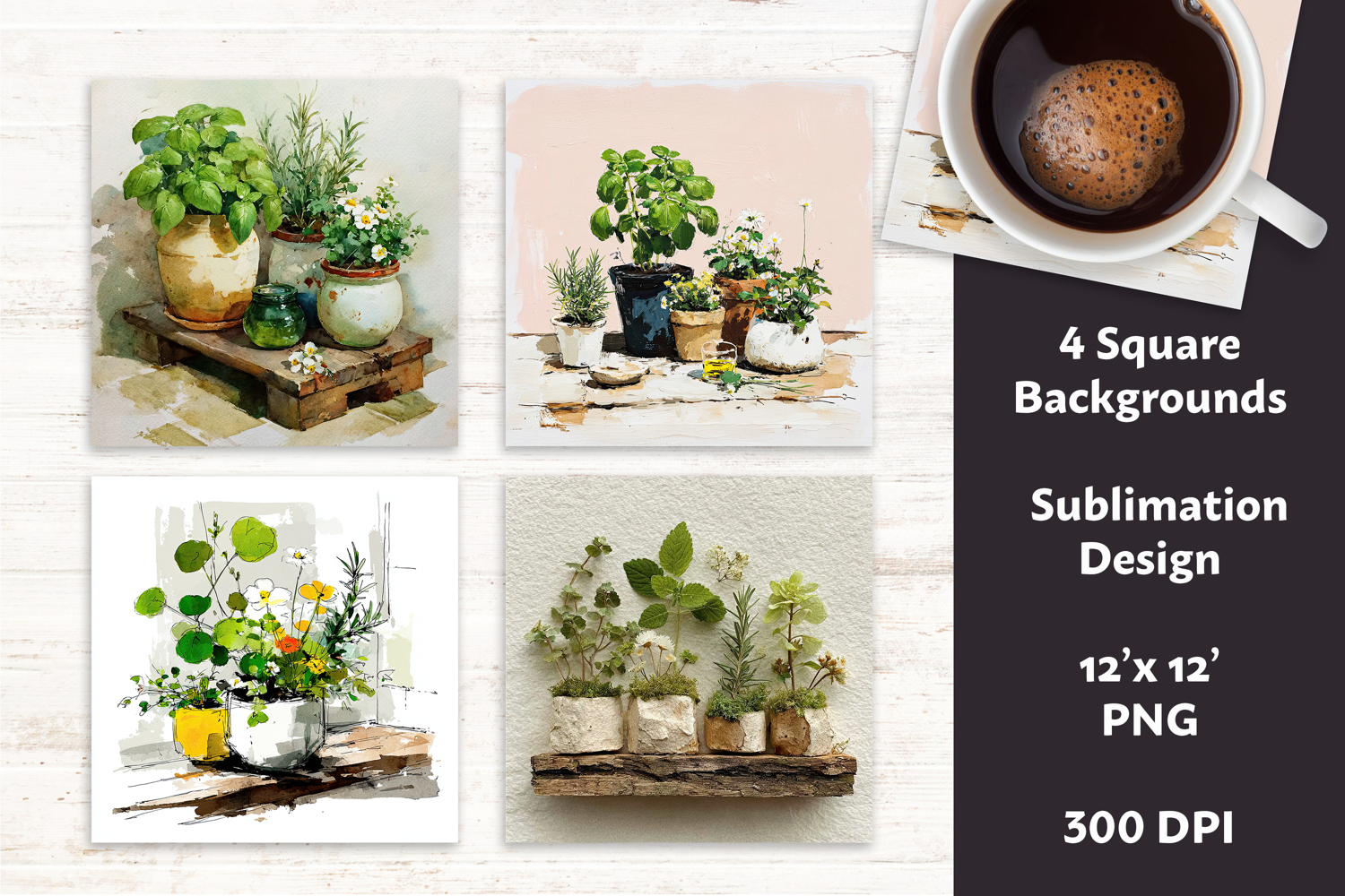 Bring the freshness of spring into your creative projects with this gentle watercolor botanical illustration featuring potted herbs — basil, rosemary, mint, and thyme — accented with tiny wildflowers. Painted in soft pastel greens and muted earth tones, this piece combines fine line-work with delicate watercolor washes and a subtle watercolor paper texture for an authentically hand-painted look.