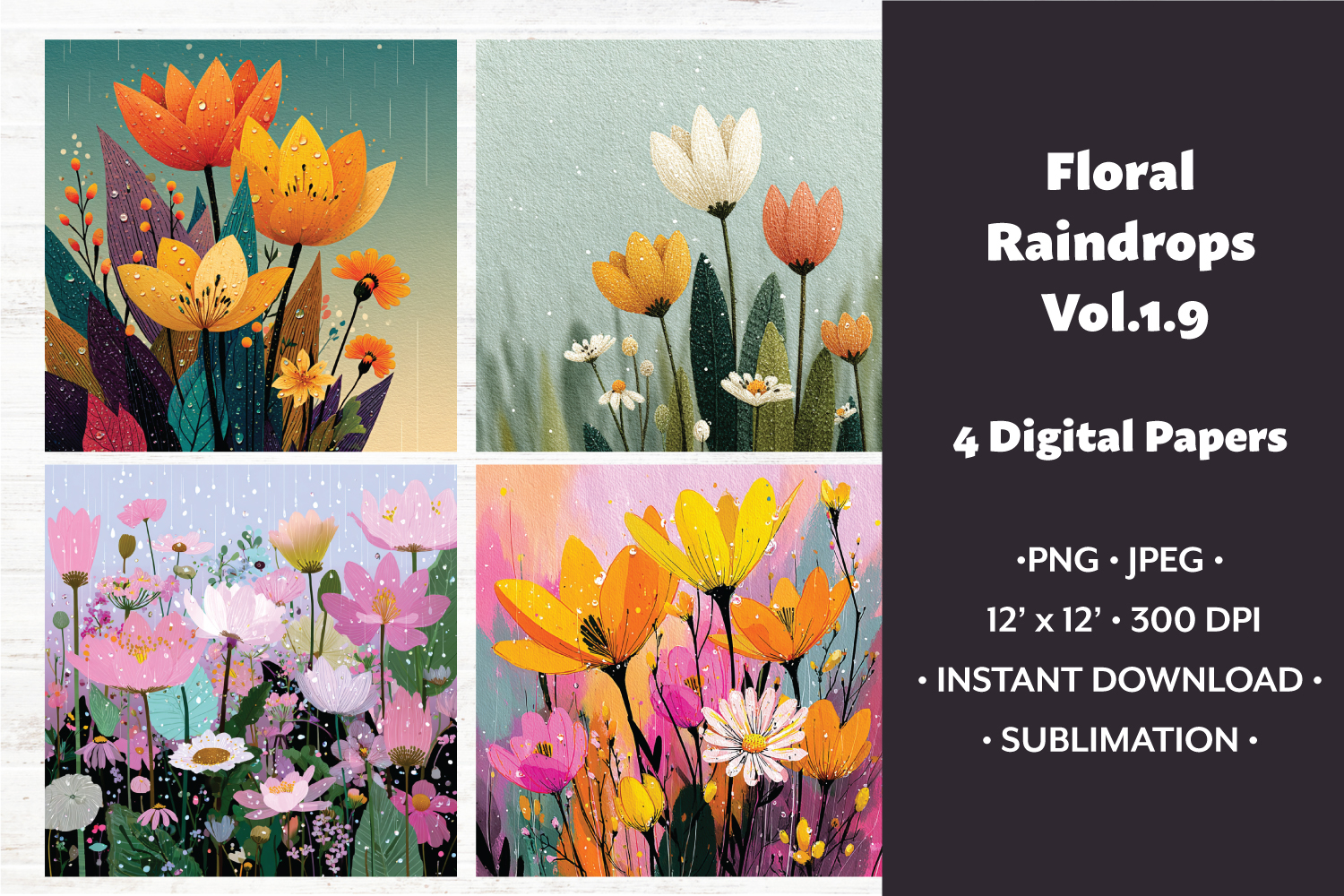 Floral Raindrops Digital Paper Vol. 1.9, 4 PNG & JPEG