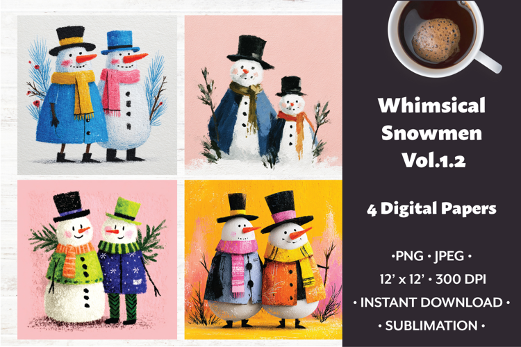 Whimsical Snowmen Digital Paper Vol. 1.2, 4 PNG & JPEG
