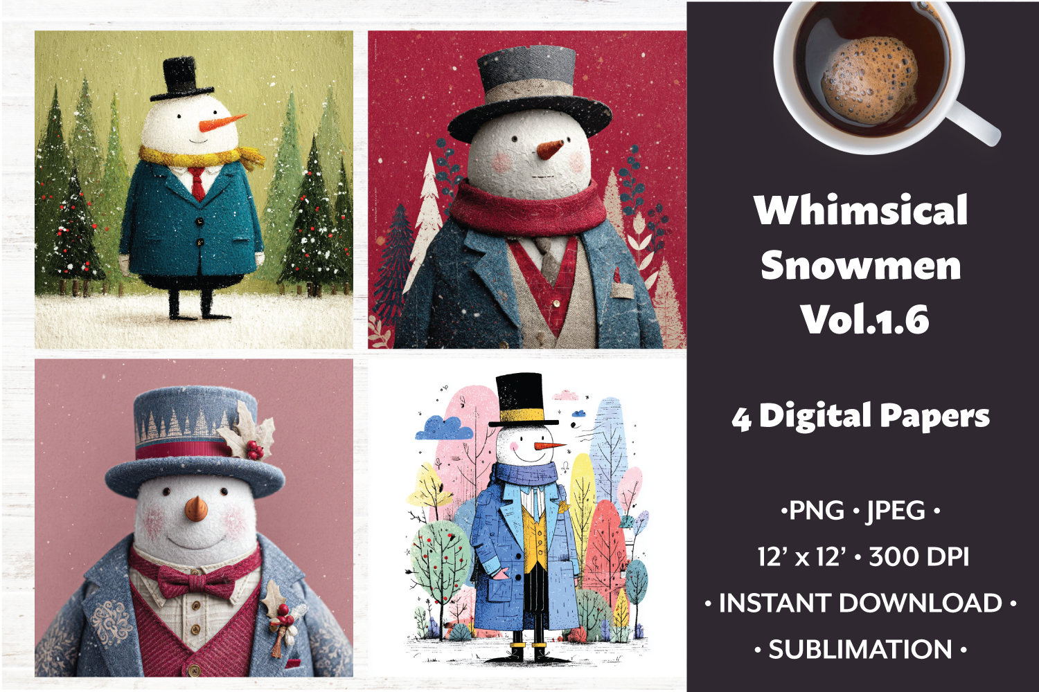 Whimsical Snowmen Digital Paper Vol. 1.6, 4 PNG & JPEG