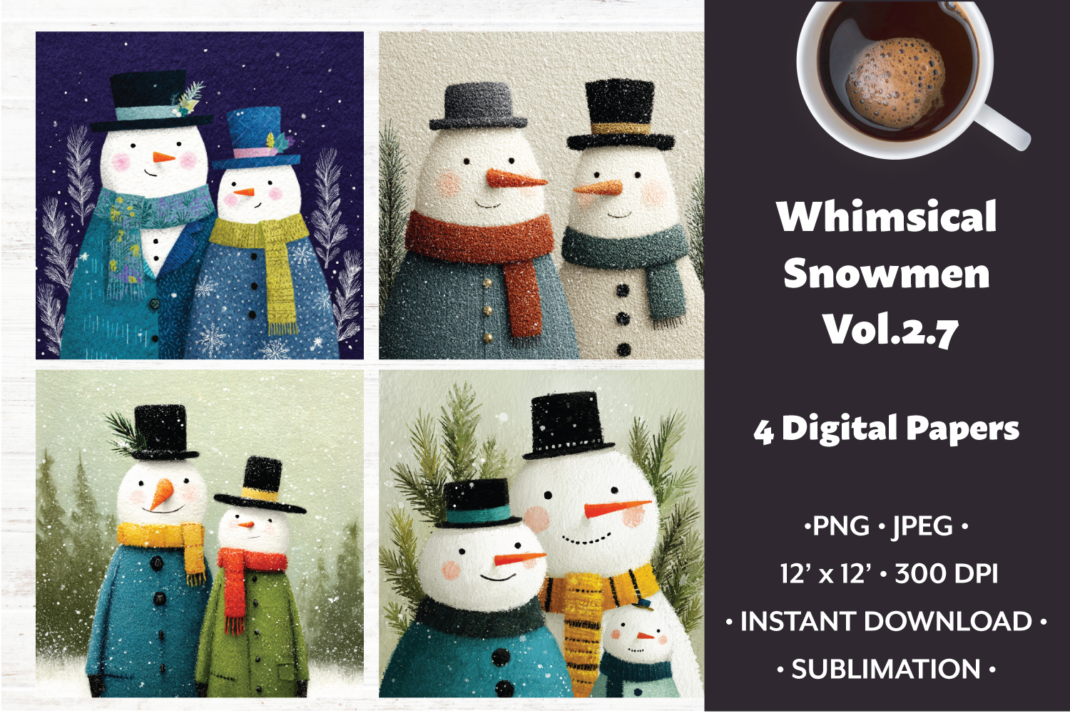 Whimsical Snowmen Digital Paper Vol. 2.7, 4 PNG & JPEG
